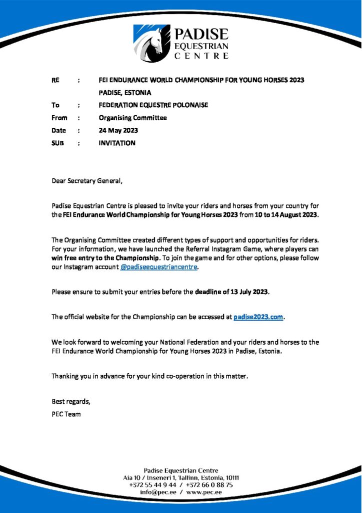 Bez kategorii INFORMACJE ZWIĄZANE Z MŚMK PADISE 2023 POL – Invitation – FEI Endurance World Championship for Young Horses – 10-14 August 2023 – Padise (EST)